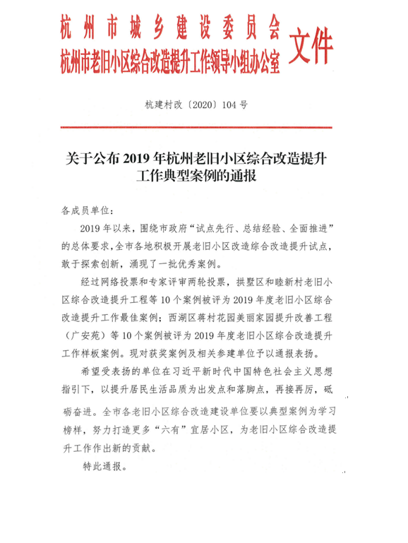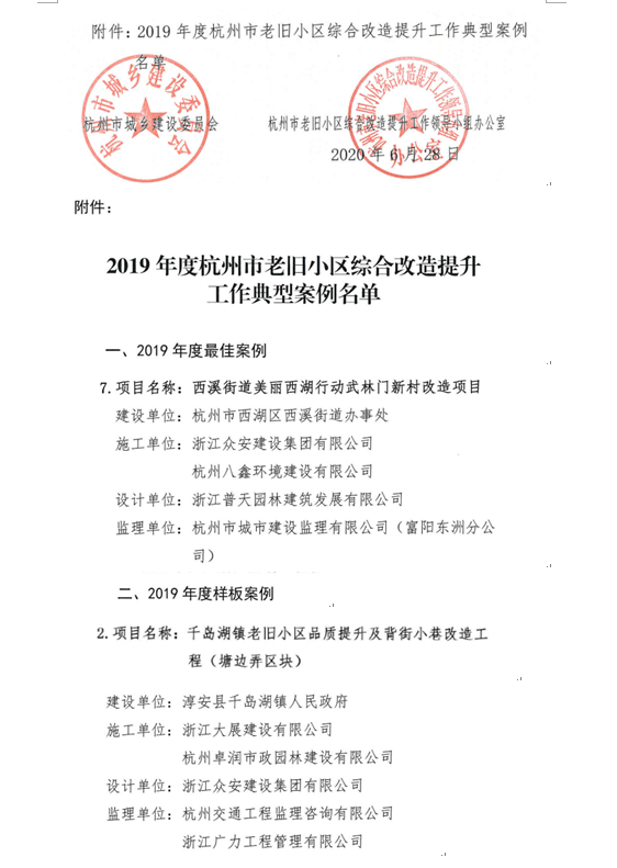 經(jīng)過專家評審,我集團——西溪街道美麗西湖行動武林門新村改造項目、千島湖鎮(zhèn)老舊小區(qū)品質提升及背街小巷改造項目被評為2019年度老舊小區(qū)綜合改造提升工作典型案例,予以通報表揚。